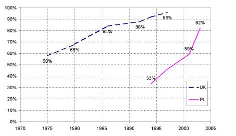 Źródło: Wyniki badań. UK: Pike (1975, 1980, 1986, 1992), Arnold & Hatzopoulos (1997);