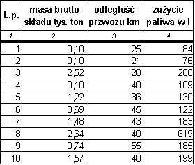 Kolejnym krokiem jest dostosowanie (obróbka) zebranych danych do postaci odpowiadającej założeniom naszego modelu funkcji kosztów. Ponieważ interesuje nas koszt jednostkowy dlatego też, będziemy liczyć zużycie paliwa w litrach, dla przejazdu na odległość 1 km , przy zadanej masie brutto pociągu wyrażonej w tysiącach ton. Z punktu widzenia naszego modelu interesują nas tylko dwie wielkości: