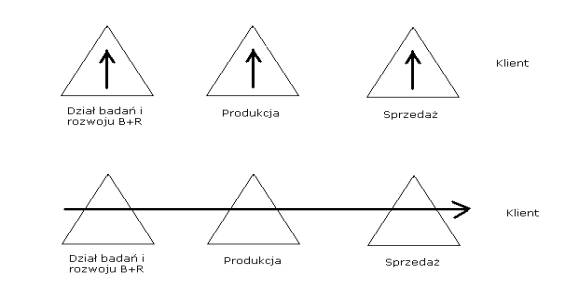 Z rysunku widzimy, że pionowe ujęcie funkcji (orientacja funkcjonalna) zostało przeorientowane na poziomą strukturę procesową, która w ostateczności orientuje przedsiębiorstwo na realizację potrzeb klientów. Takie przemodelowanie niezbędne jest w korzystaniu z różnych nowych narzędzi do zarządzania. Takimi narzędziami są chociażby rachunek kosztów działań, kompleksowe zarządzanie jakością czy zrównoważona karta dokonań, w których widoczne czynności i działania mają widoczny charakter procesowy. Zarządzanie oparte na zmiennym cyklu produkcyjnym (zarządzanie przez ograniczanie czasu) to również narzędzie z charakterystycznym układem procesów w przedsiębiorstwie.
